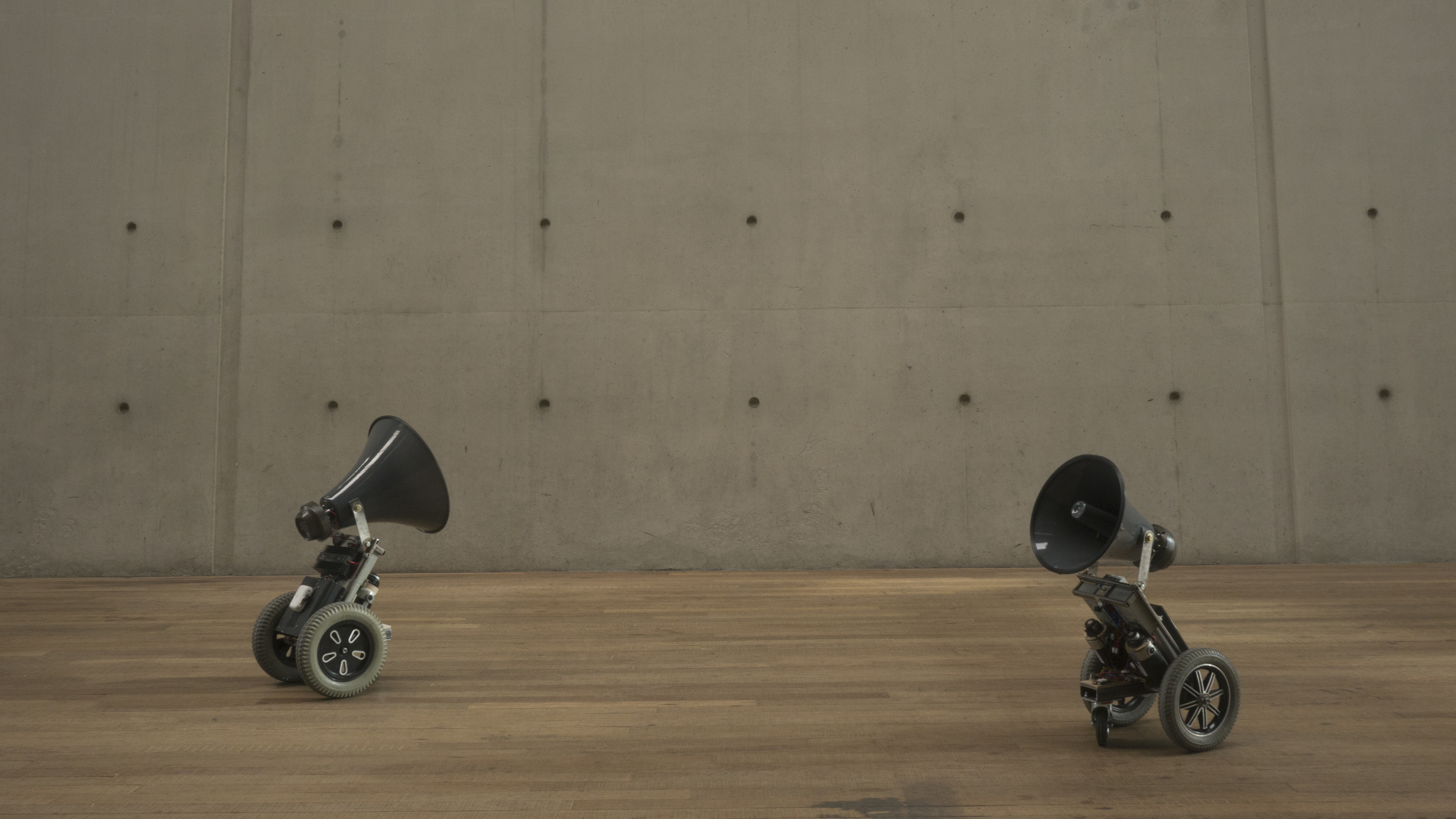 Echo Moiré is a robotic opera-ballet in which a pair of loudspeaker vehicles is employed to play a room as a musical instrument. Exploring the acoustic properties of the room, the vehicles create aural images that float in the air, enveloping listeners with patterns of echoes rebounding off the walls.